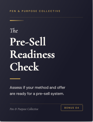 A focused self-assessment that scores how ready your method and offer are for a pre-sell system, then tells you whether to build now, build with support, or gather a bit more data first.